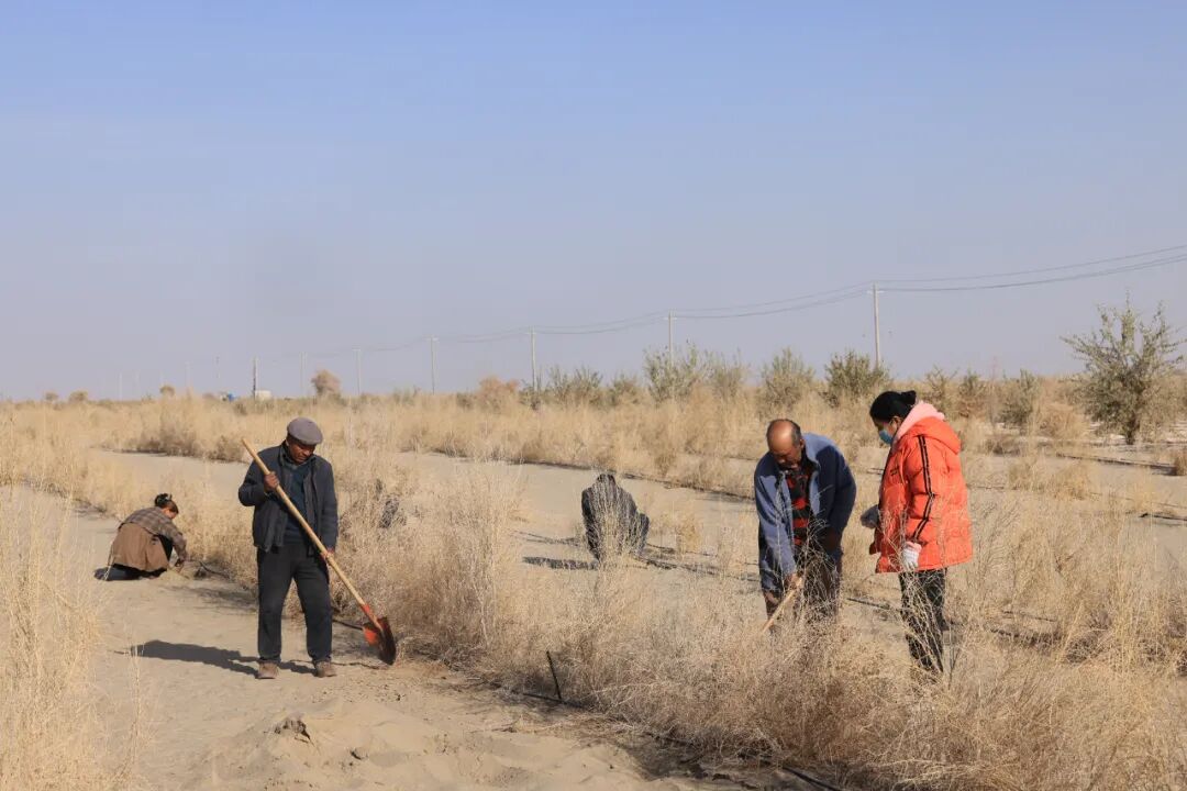 在沙地里,人們正在揮鍬鏟沙種植樹苗。喀什地區融媒體中心 記者陳文軍 攝