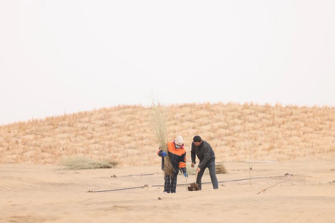 人們正在沙地上種植樹苗。喀什地區融媒體中心 記者陳文軍 攝