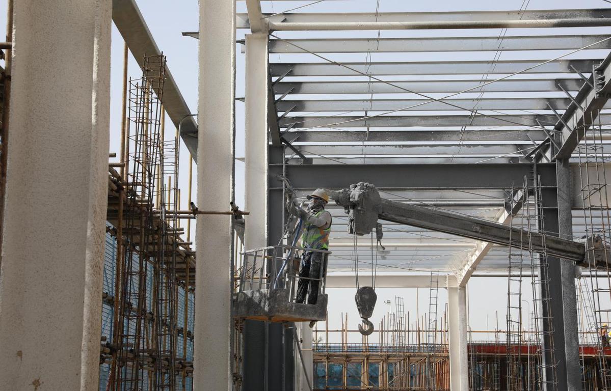 新疆睿宸紡織有限公司30萬錠紡紗項目建設現(xiàn)場,工人正在給主體鋼架噴灑防腐涂料(資料圖)。程永超 攝